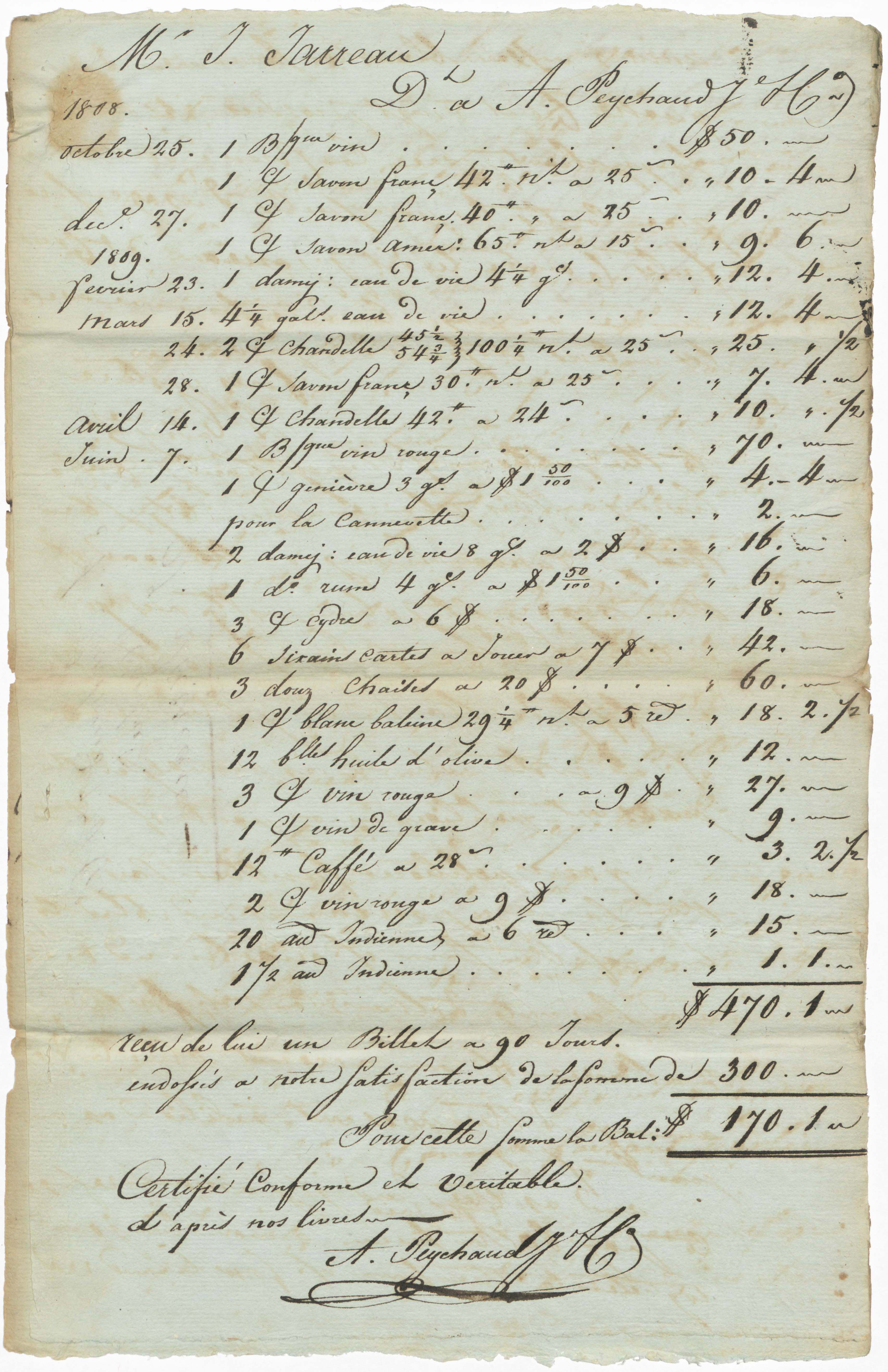 Account of goods sold by A. Peychaud & Co. to Jean Jarreau in 1808 and 1809. Jarreau probably used the wines and liquors--and the playing cards--at his coffeehouse on the left bank of Bayou St. John. We originally thought that A. Peychaud was Antoine Amedee Peychaud (better known as the pharmacist who created the bitters that still bear his name), but additional evidence suggests that he was actually Paul Mathias Anatole Peychaud. Anatole was a New Orleans merchant and officeholder who once ran unsuccessfully for mayor.