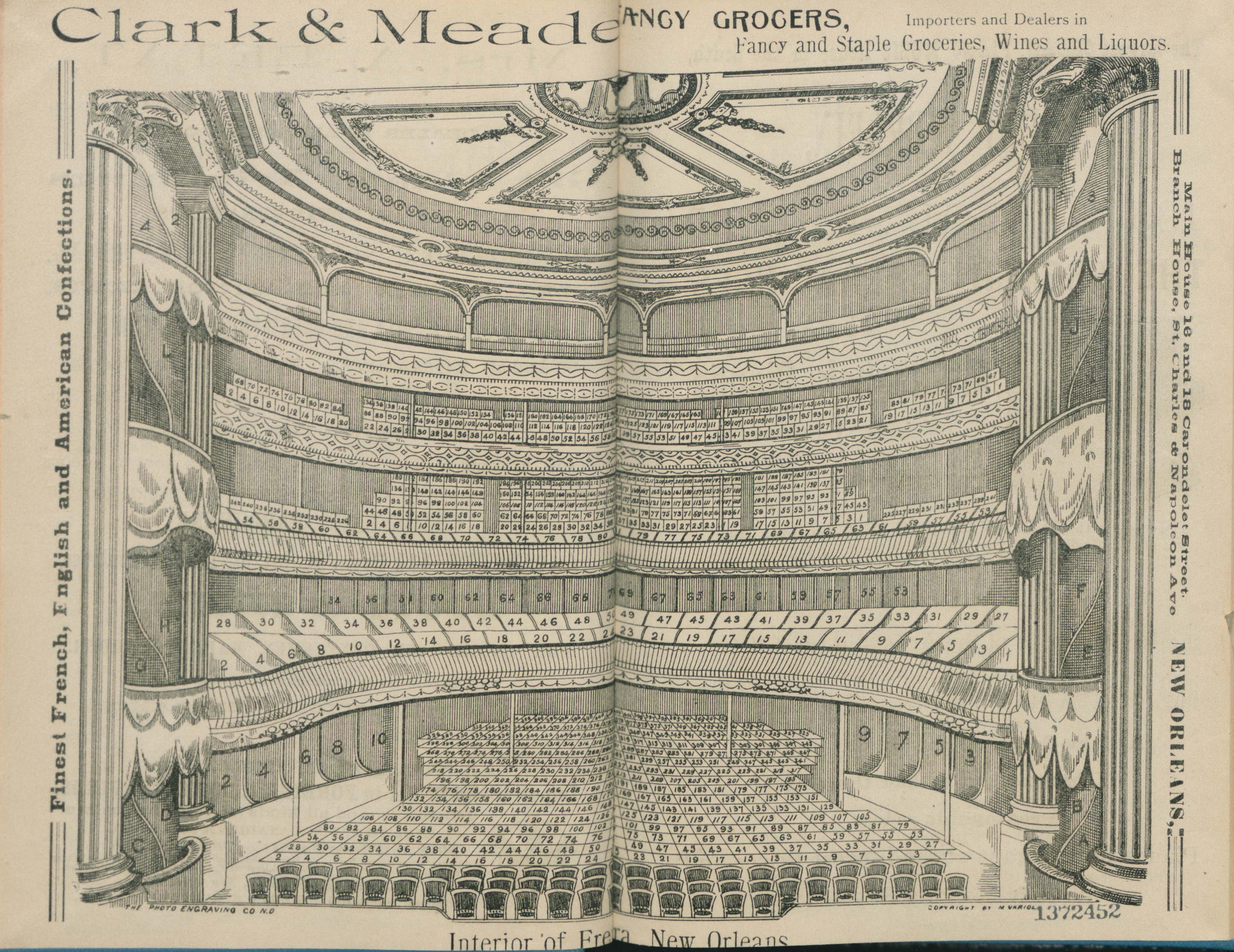 This seating plan for the French Opera House appears in a copy of the libretto of Charles Gounod’s opera Mireille. The elaborately decorated theater seated 2078, including 500 unreserved seats in the fourth balcony. At the time, the theater was the largest in the United States. In 1919, just before the fire that destroyed it, tickets could be had for from 28 cents to $1.65 for matinees and 55 cents to $3.30 for evening performances.