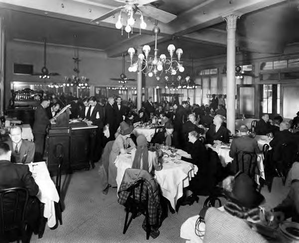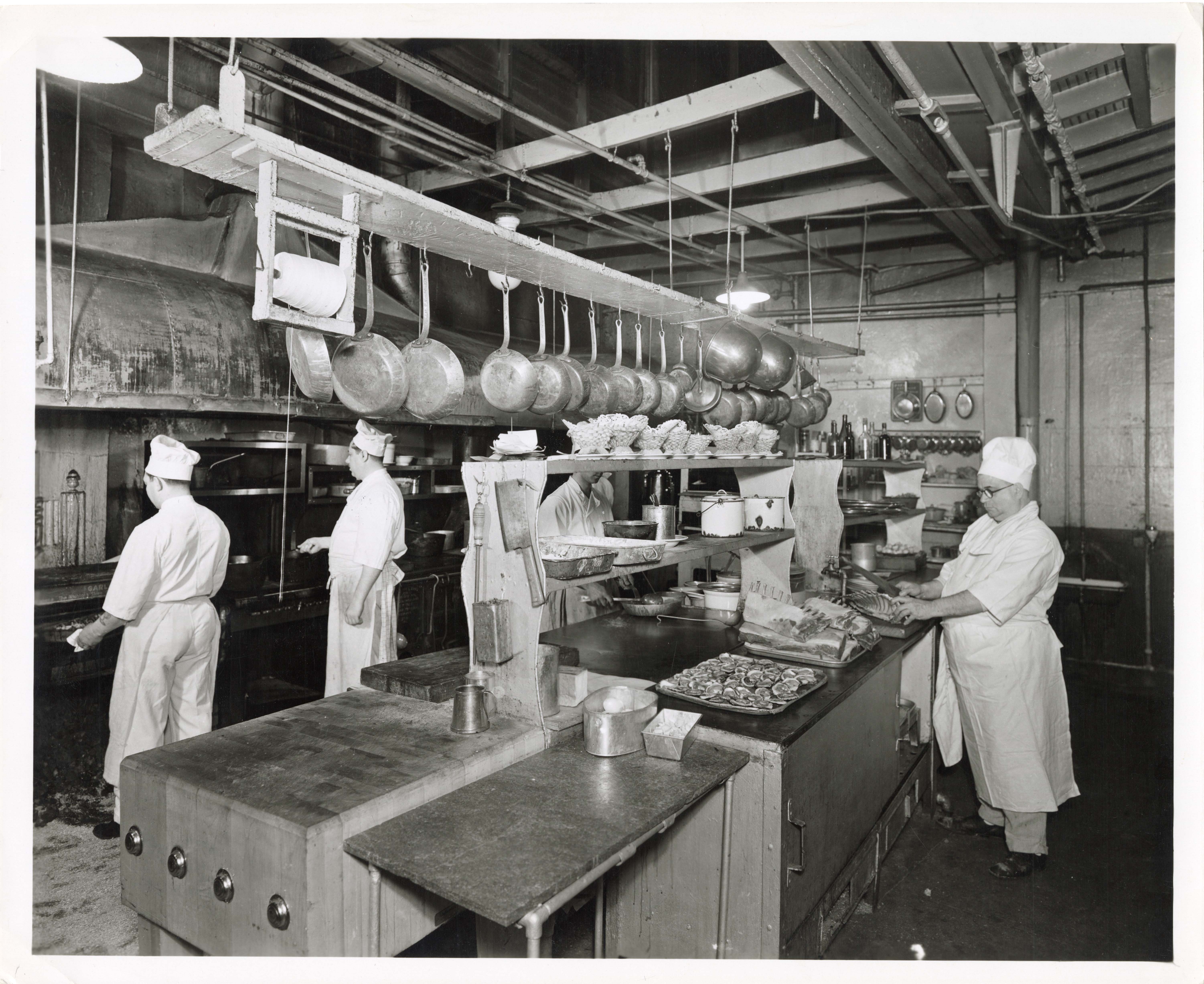 The kitchen at Antoine’s as it appeared in 1951. The restaurant’s chefs were still using ancient coalburning stoves to prepare meals for their many patrons. Note the oyster shells ready and waiting to be transformed into Oysters Rockefeller and the row of little baskets, soon to be filled with the delectable souffléed potatoes.