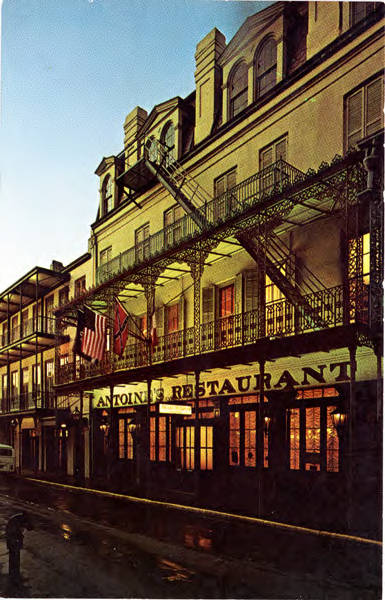 Antoine’s is probably the world’s most famous restaurant…. Many of the marvelous dishes on the menu were invented or brought over from France in the 1830s by founder Antoine Alciatore. He began his career at the age of twelve, working in the kitchen of the Hotel de Noailles in Marseilles….Arriving in the French city of New Orleans at the mouth of the Mississippi, he worked briefly at the St. Charles Hotel. In 1840 he opened a pension on St. Louis Street. In the dining room downstairs he served his guests not only Pommes Soufflees, but his own creations, Boeuf Robespierre and Dinde Talleyrand.