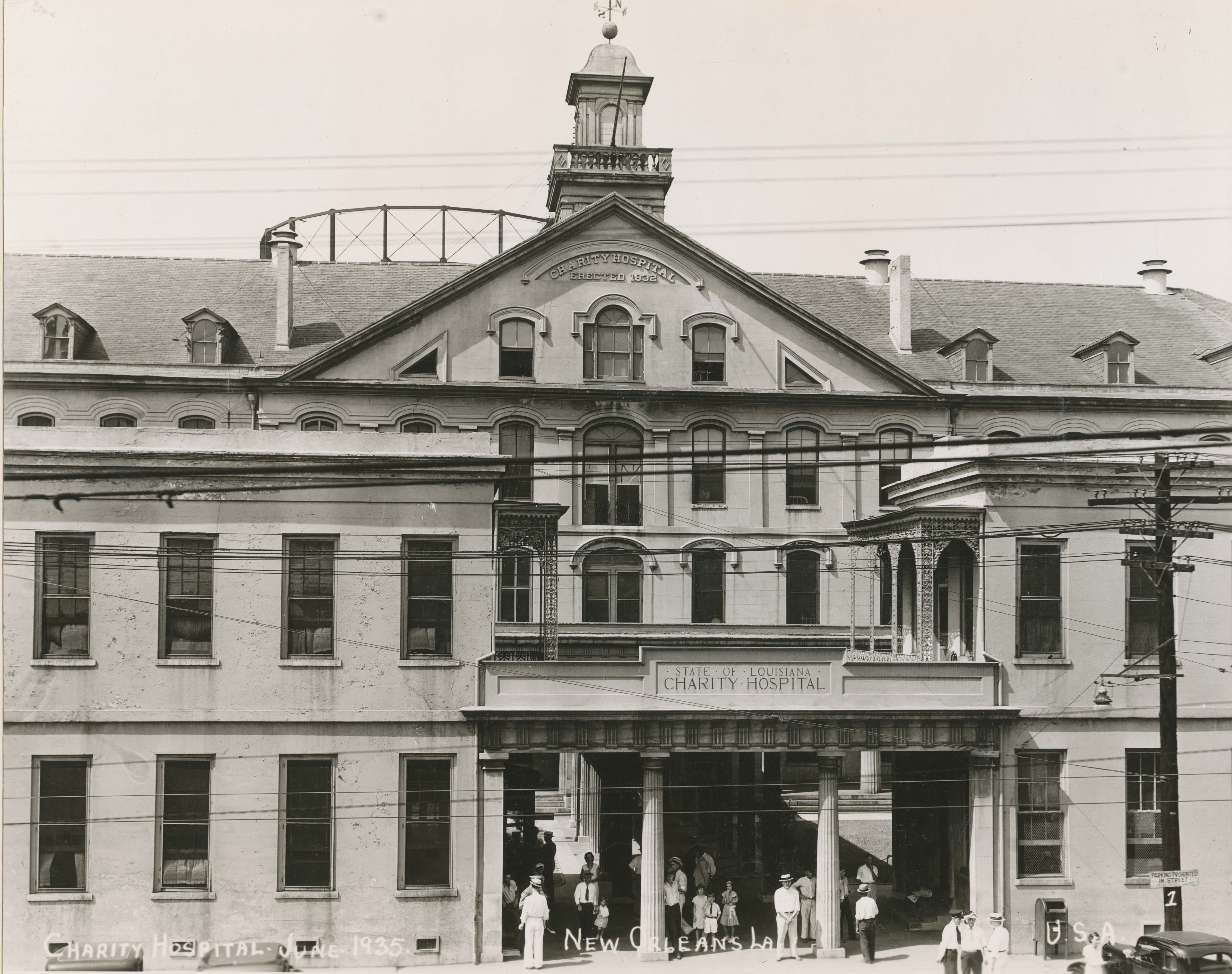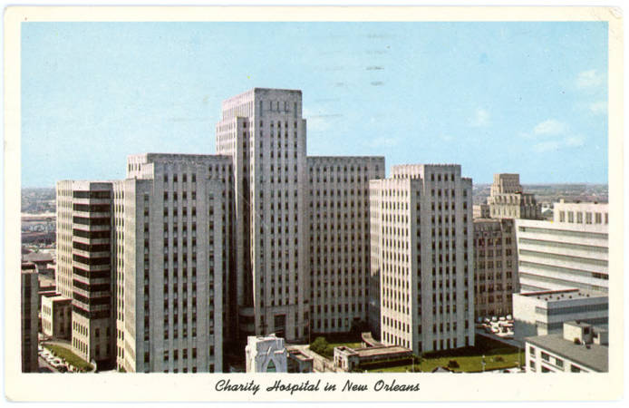 Charity Hospital started in the Vieux Carré during the eighteenth century, moved around for a while (including several years on Canal Street in a building that later became the State Capitol), and wound up on Common Street in 1832. It continued to care for the less fortunate citizens of New Orleans, including many recent immigrants, at that same location until the flood of 2005 shut everything down. We can’t begin to describe all of the many changes that affected Charity during its days in the neighborhood, so we’ll just present a few interesting visual examples.
