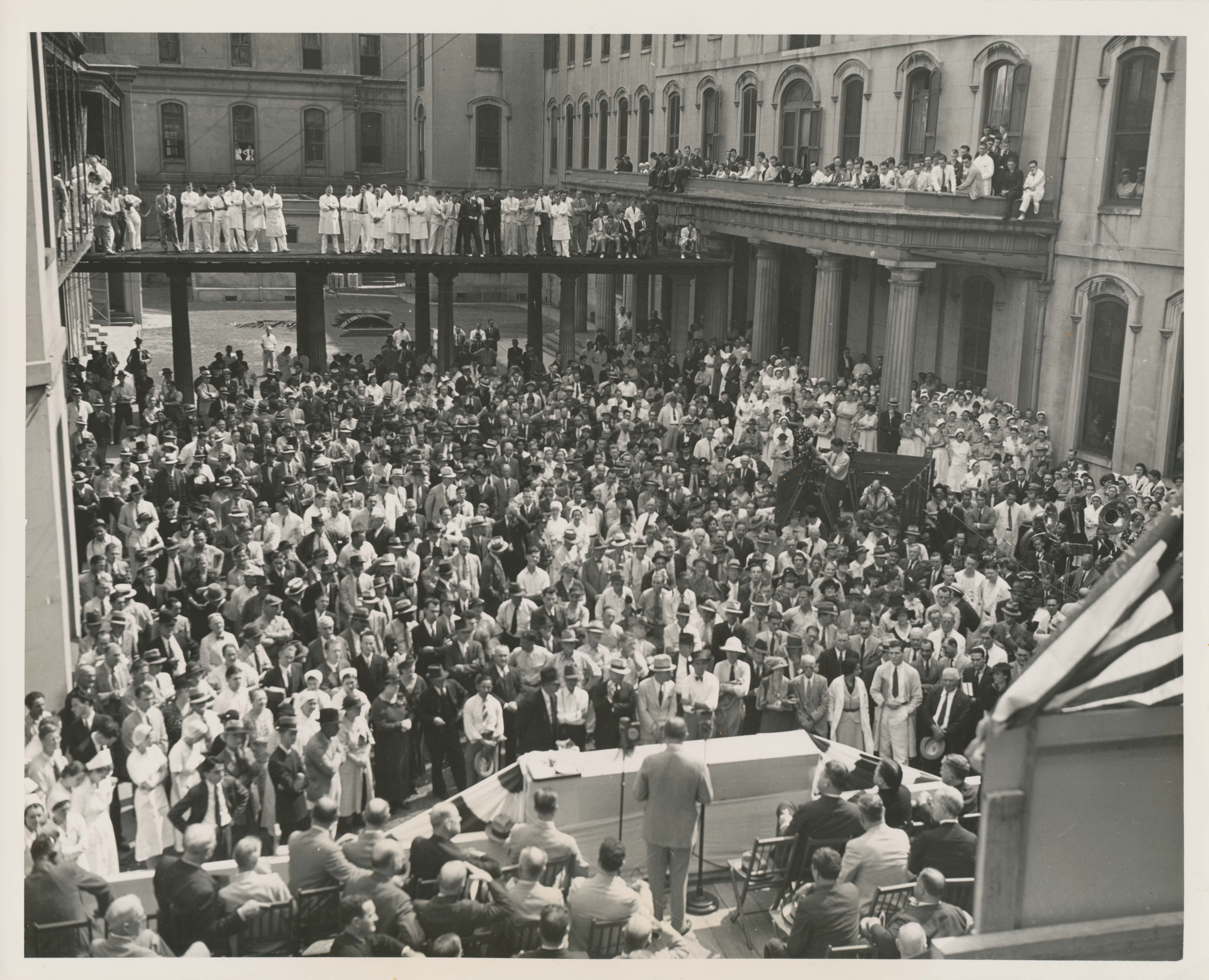 After 100 years on Tulane Avenue, Charity Hospital’s facilities were inadequate to meet the needs of a growing, modern city. Several new buildings were added to the overall hospital complex and, in 1936, a grant from the federal government made replacement of the main hospital possible. Demolition of “old Charity” began soon thereafter; this photograph shows the ceremonial beginning of that project in the hospital courtyard on September 17, 1936.