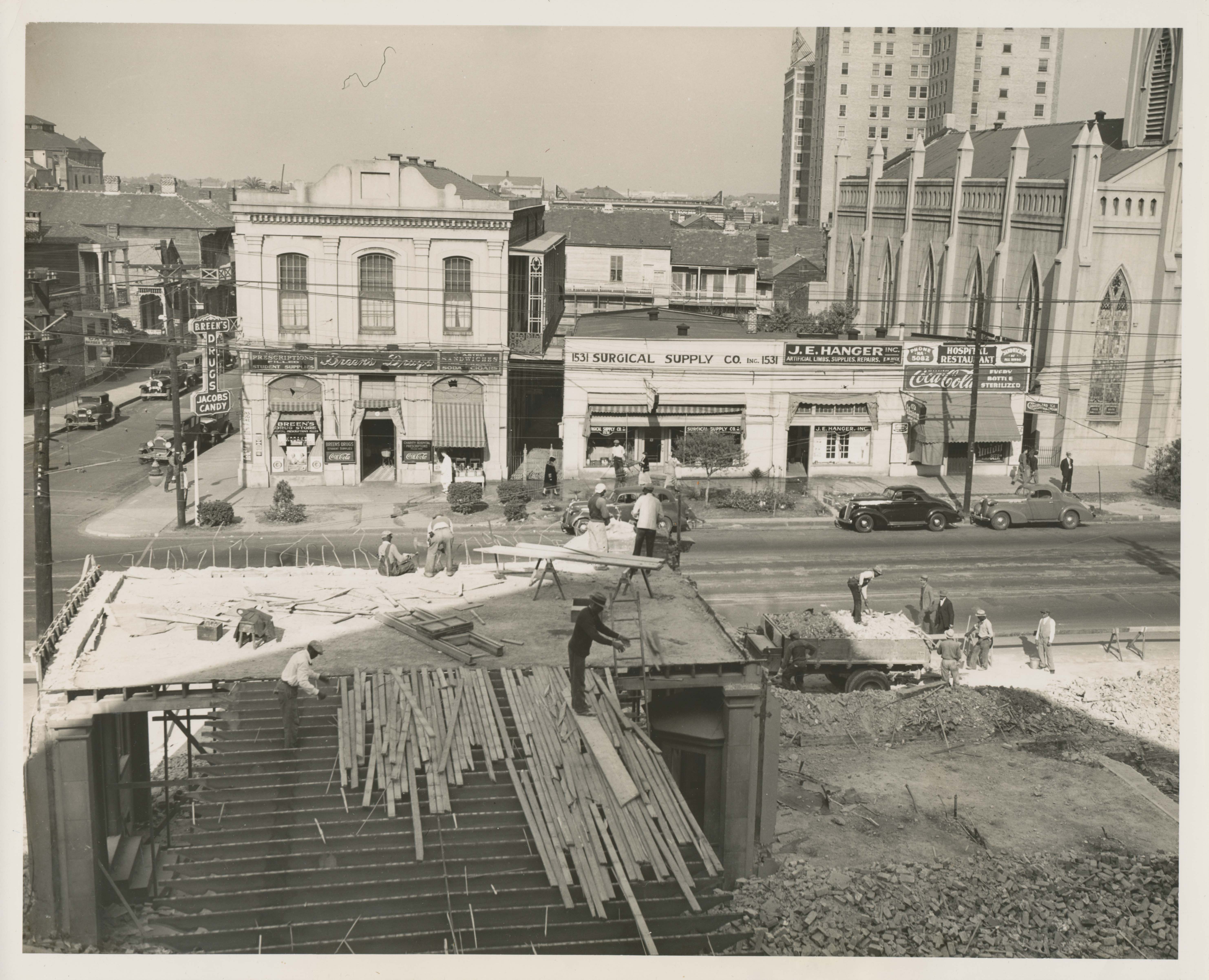 This 1948 view up Elk Place from Canal Street shows the Pythian Temple/Industries Building, Criminal Court Building, and the Eye, Ear, Nose and Throat Hospital all together at a time just before major change came to the scene. Note that foundation work appears to be underway for a new addition to the Eye, Ear, Nose and Throat Hospital.