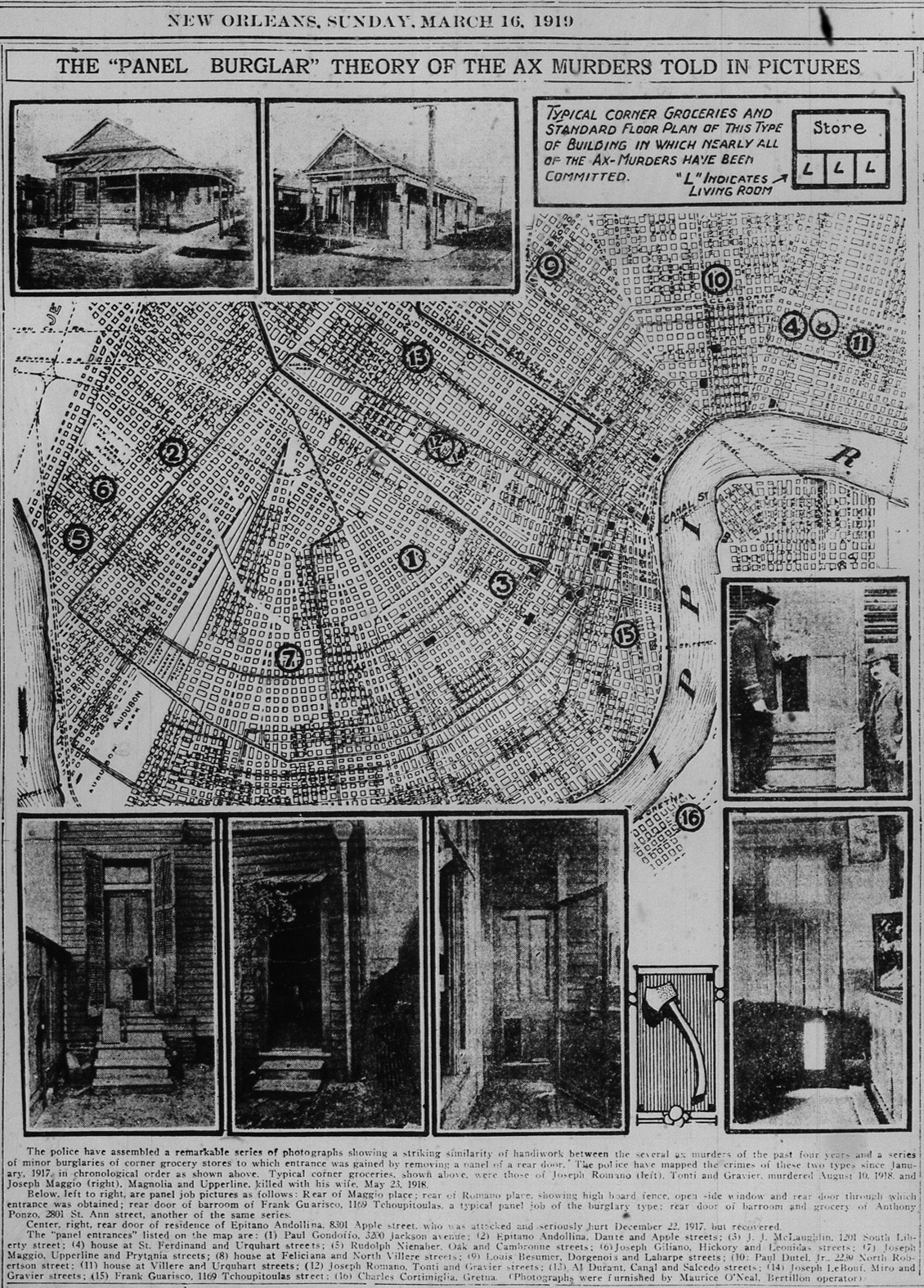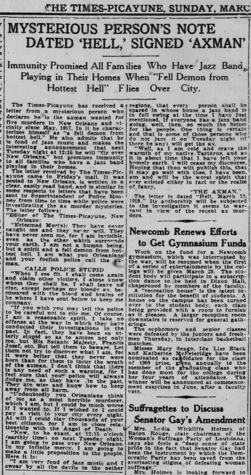 From 1918-1919 a serial killer stalked the streets of New Orleans, breaking into homes and murdering people with an ax found in their home. Most of the victims were Italian grocers. In addition to the grizzly murders, what makes the Axman so compelling is that just as the Police determined that these attacks were likely the actions of one individual, and identified some earlier attacks that appeared to also be related, a letter was sent to the local newspapers by a writer claiming to be ‘The Axman.’ The writer stated their intention to strike again at 12:15pm on St. Joseph’s Day (March 19, 1919), but promised to spare the life anyone playing or listening to jazz music at that time.