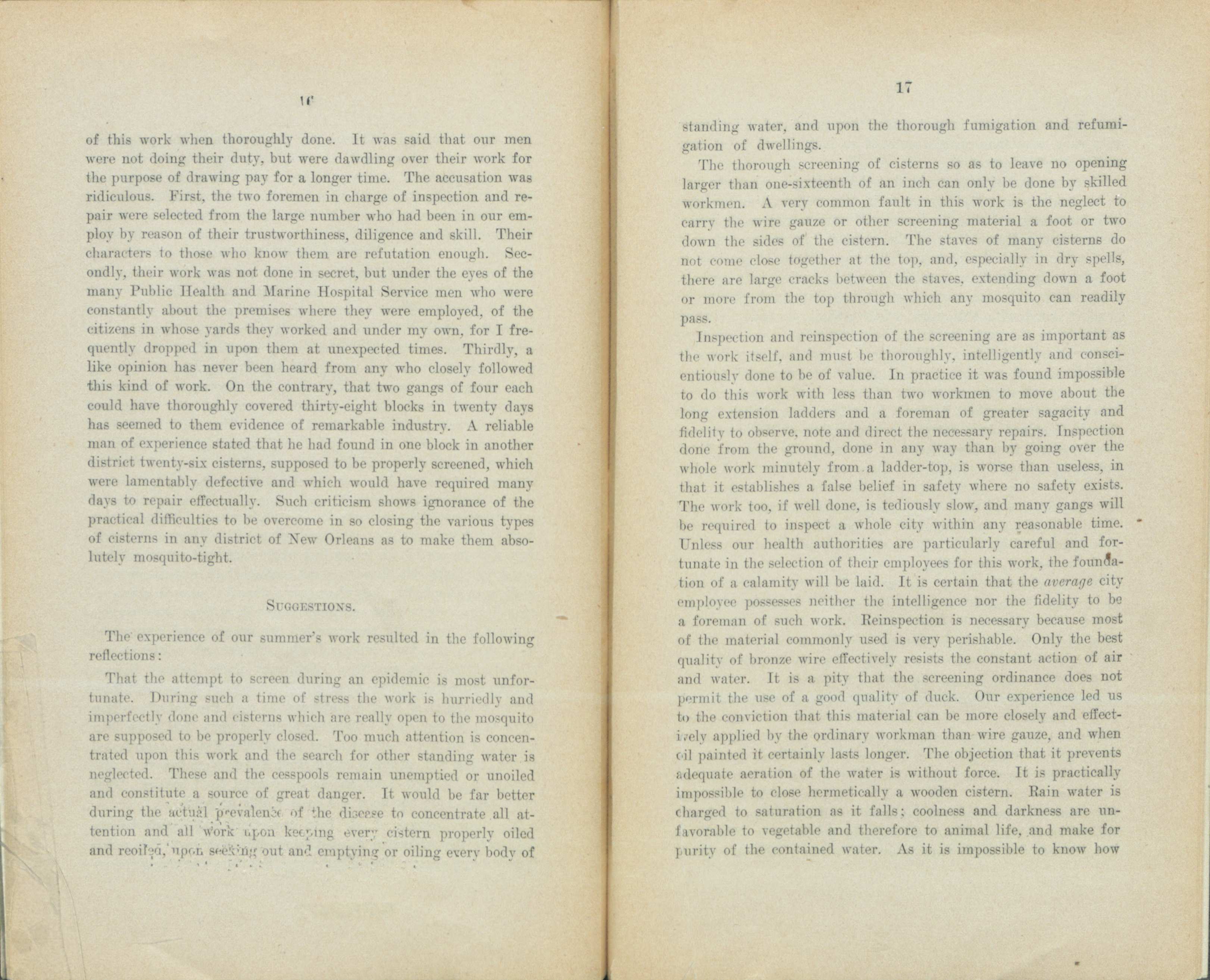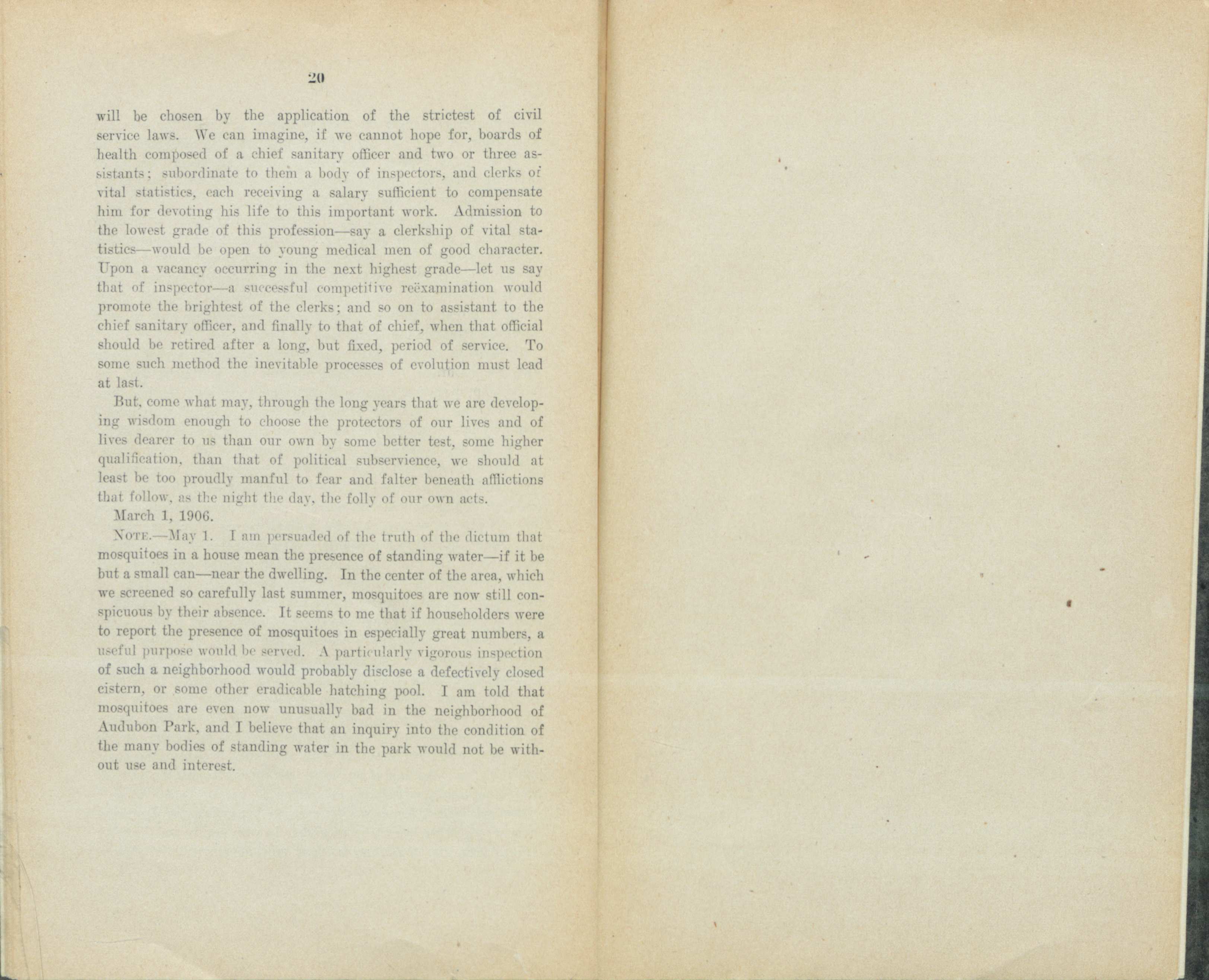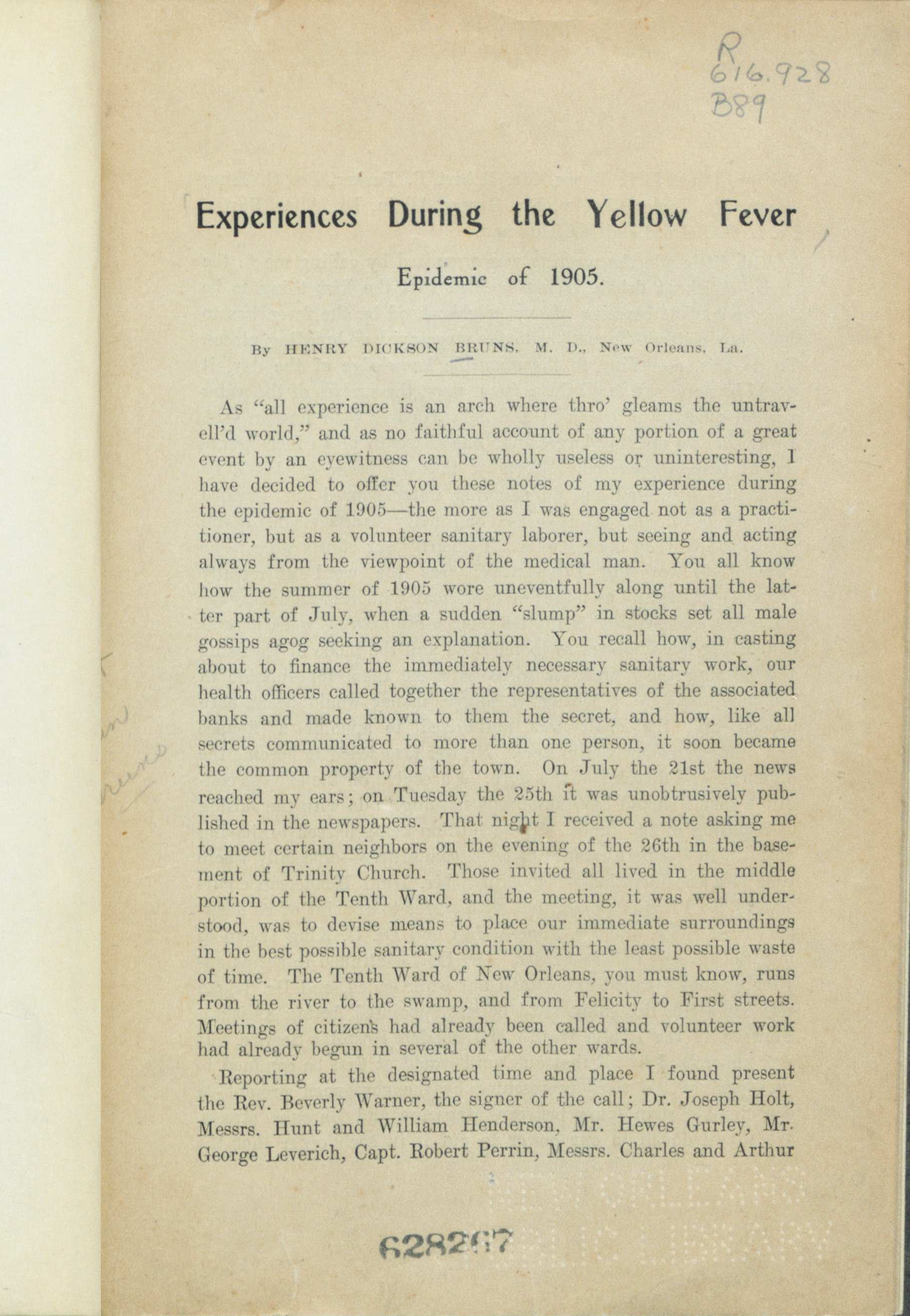 Experiences during the yellow fever epidemic of 1905 (LOUR 616.928 B89): Dr. Henry Dickson Bruns describes his work volunteering as sanitary laborer during the summer of 1905.