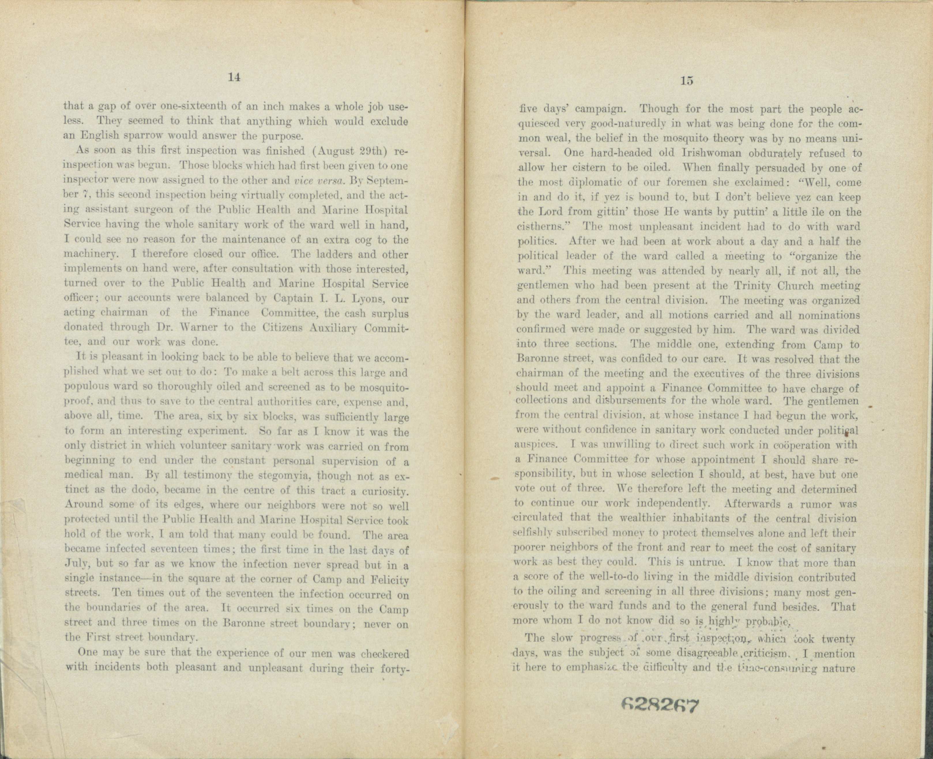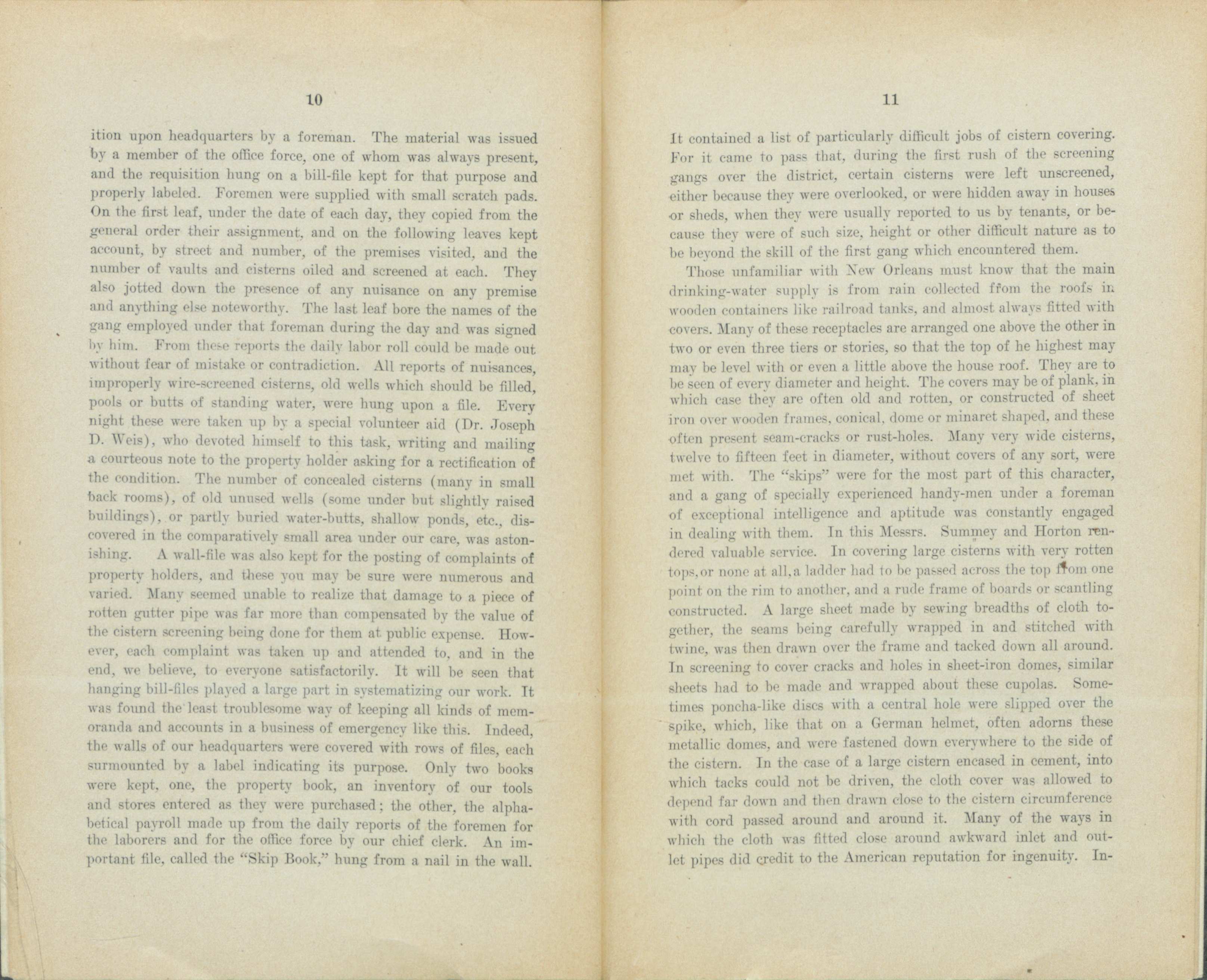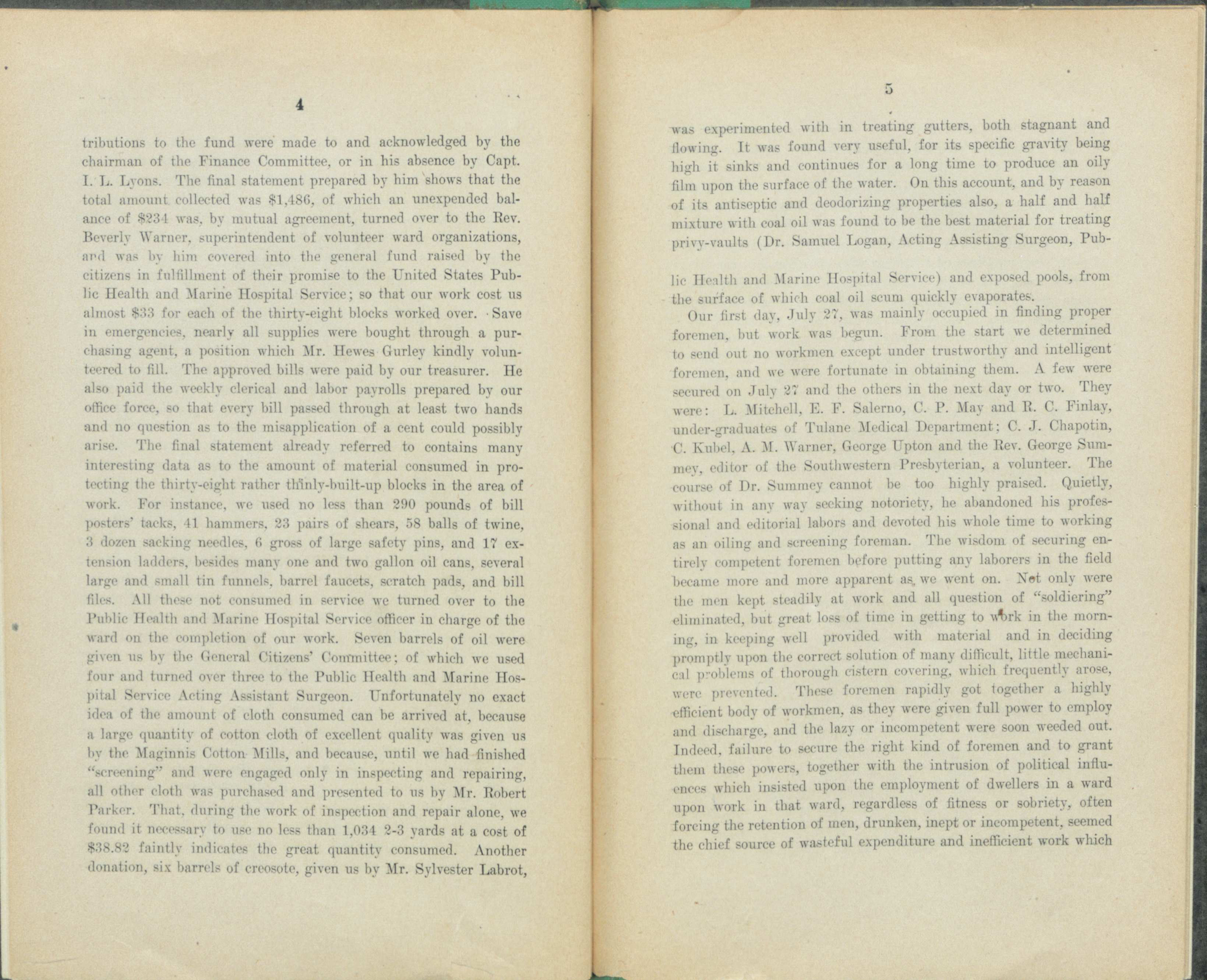 Experiences during the yellow fever epidemic of 1905 (LOUR 616.928 B89): Dr. Henry Dickson Bruns describes his work volunteering as sanitary laborer during the summer of 1905.