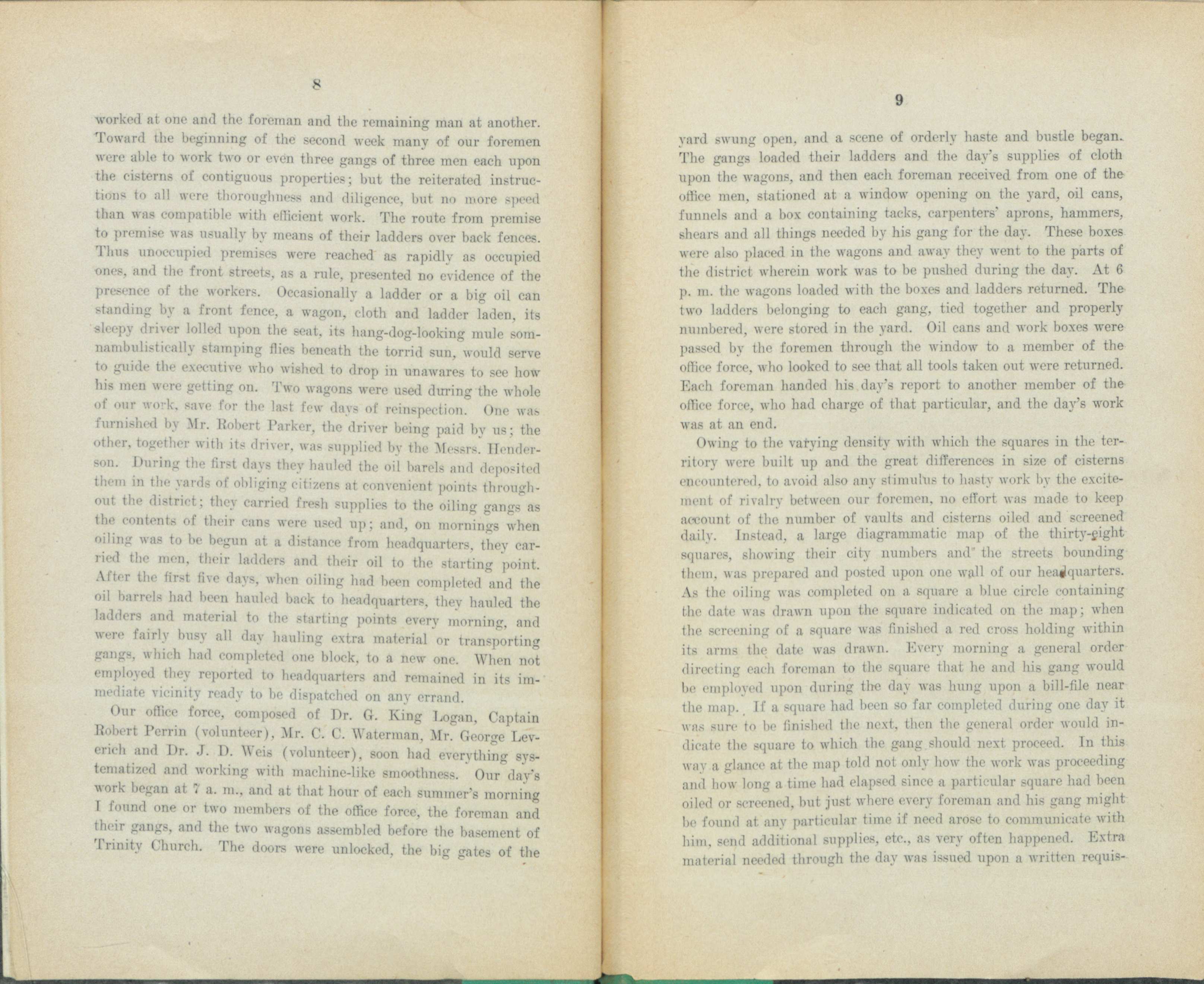 Cisterns, where most of the City’s drinking water came from, provided a perfect breeding ground. By August, with the encouragement of the Health Department and the cooperation of City Council and the Mayor, Ordinance 3196 NCS (see below) was passed, that required the treatment, covering and draining of cisterns and other sitting bodies of water. The ordinance gave the Health Department the authority to inspect private property for non-compliance and recommend punishment such as fines and Jail Time.