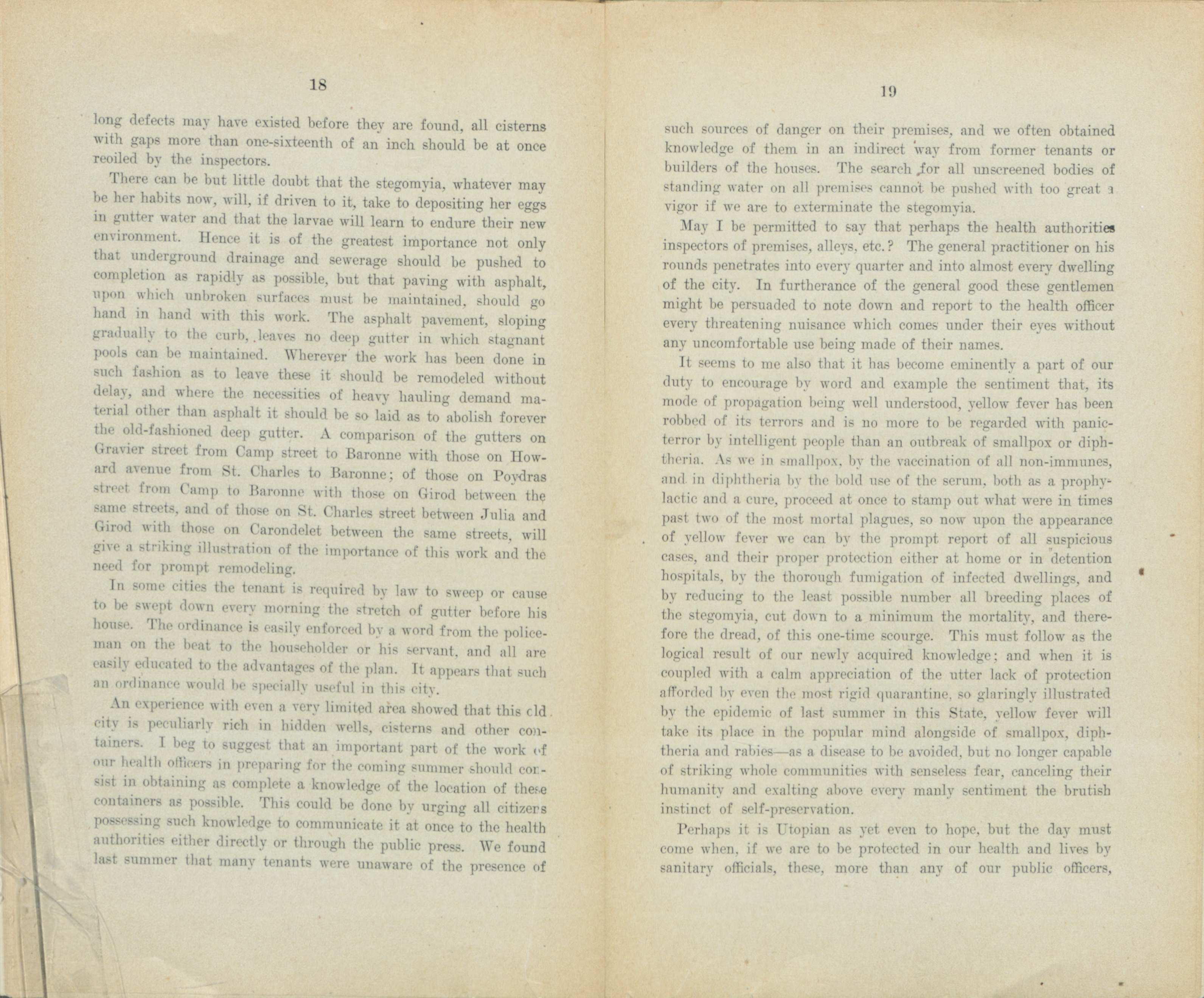 Dr. Quitman Kohnke, the head of the New Orleans health board, beseeched the city to address the mosquito issue. “Even if you are not positive that the mosquito is the only source of the transmission of yellow fever,” he told physicians, “give your city the benefit of the doubt in this important and vital matter.”